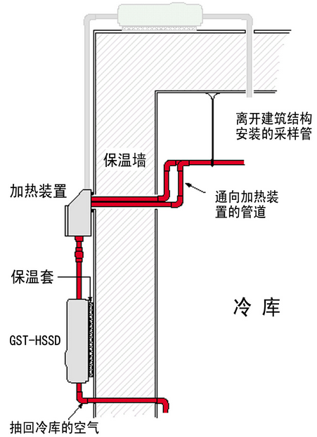 冷庫(kù)中采樣管,加熱箱和吸氣式感煙火災(zāi)探測(cè)器的相對(duì)位置