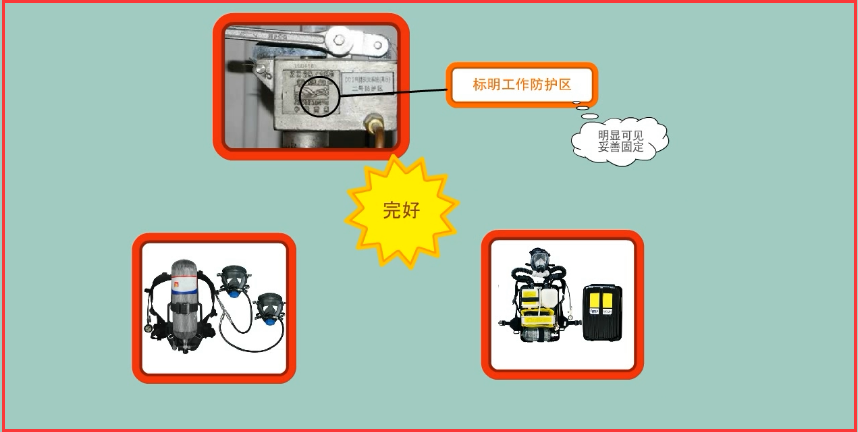 4、防護(hù)區(qū)外專用的空氣呼吸器或氧氣呼吸器是否完好;