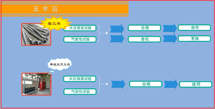 2、五年后,對(duì)釋放過(guò)滅火劑的儲(chǔ)瓶、相關(guān)閥門(mén)等部件進(jìn)行一次水壓強(qiáng)度和氣體密封性試驗(yàn),試驗(yàn)合格方可繼續(xù)使用。