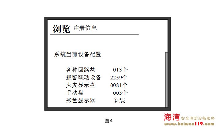 完成以上操作后,系統(tǒng)上電進(jìn)行初始化(畫面顯示如圖1所示)。初始化完成后進(jìn)入對運行記錄、隔離信息、聯(lián)動公式、聲光電源的自動檢查狀態(tài)(畫面顯示如圖2所示),自檢完畢,控制器對外接火災(zāi)顯示盤、探測器和模塊進(jìn)行注冊(如圖3所示),并顯示注冊信息 (如圖4所示) 。至此,開機(jī)過程結(jié)束,系統(tǒng)進(jìn)入正常監(jiān)控狀態(tài)。主機(jī)鍵盤上設(shè)有“自檢”鍵,按下此鍵后系統(tǒng)將進(jìn)行和開機(jī)時相同的聲光及電源檢查。 關(guān)機(jī)過程按照與開機(jī)時相反的順序關(guān)掉各開關(guān)即可。要注意各個備電開關(guān)一定要關(guān)掉,否則,將有損壞電池的可能。