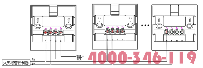 “S+”、“S-”為總線端子,接入火災報警控制器;“T+”、“T-”為對講電話接線端子,可根據(jù)需要接入消防電話主機。