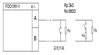 如上圖,AB端引出的兩根線接在被監(jiān)控設備的干節(jié)點觸點兩端(常開或常閉),電阻Rp接在被監(jiān)控設備端。顧名思義,監(jiān)控開路就是指當A、B兩根線任何一根與被監(jiān)控設備的連接中斷就會報開路故障。這也是為什么Rp接在被監(jiān)控設備端的目的。如果接在輸入模塊端,那么即使連線出現(xiàn)中斷,也不報故障,這樣正常的輸入信號就無法傳遞給輸入模塊,消防主機也無法報出事件。